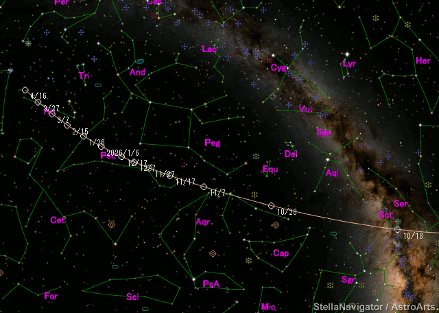 تصویربرداری با تلسکوپ TALL 125 و دوربین عکاسی Canon 5D در رسدخانه دانشگاه کاشان انجام شده است. زمان نوردهی ۴۰ ثانیه و حساسیت ۳۲۰۰ بوده است. میتوانید ببینید که دنبالهدار چندان درخشانی نیست. هرچند با دوربین دوچشمی و تلسکوپهای کوچک هم میتوان آن را در این شبها در آسمان پیدا کرد. اما دُم یا گیسوی دنبالهدار را نمیتوان دید. در تصویربرداری هم گیسوی دنبالهدار هویدا نشده است. در نگاره دوم جایگاه این دنبالهدار را در نقشه آسمان بر پایه گاهشماری میلادی در این شبها میتوانید ببینید.